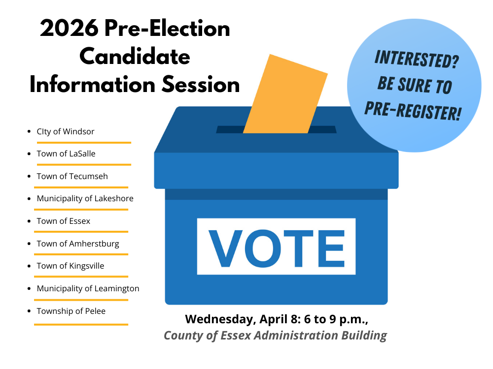 Anyone interested in attending – in person, or virtually via Zoom – can register here: https://eforms.countyofessex.ca/Council-Services/2026-Elections-and-Events/2026-Regional-Pre-Election-Candidate-Info-Session